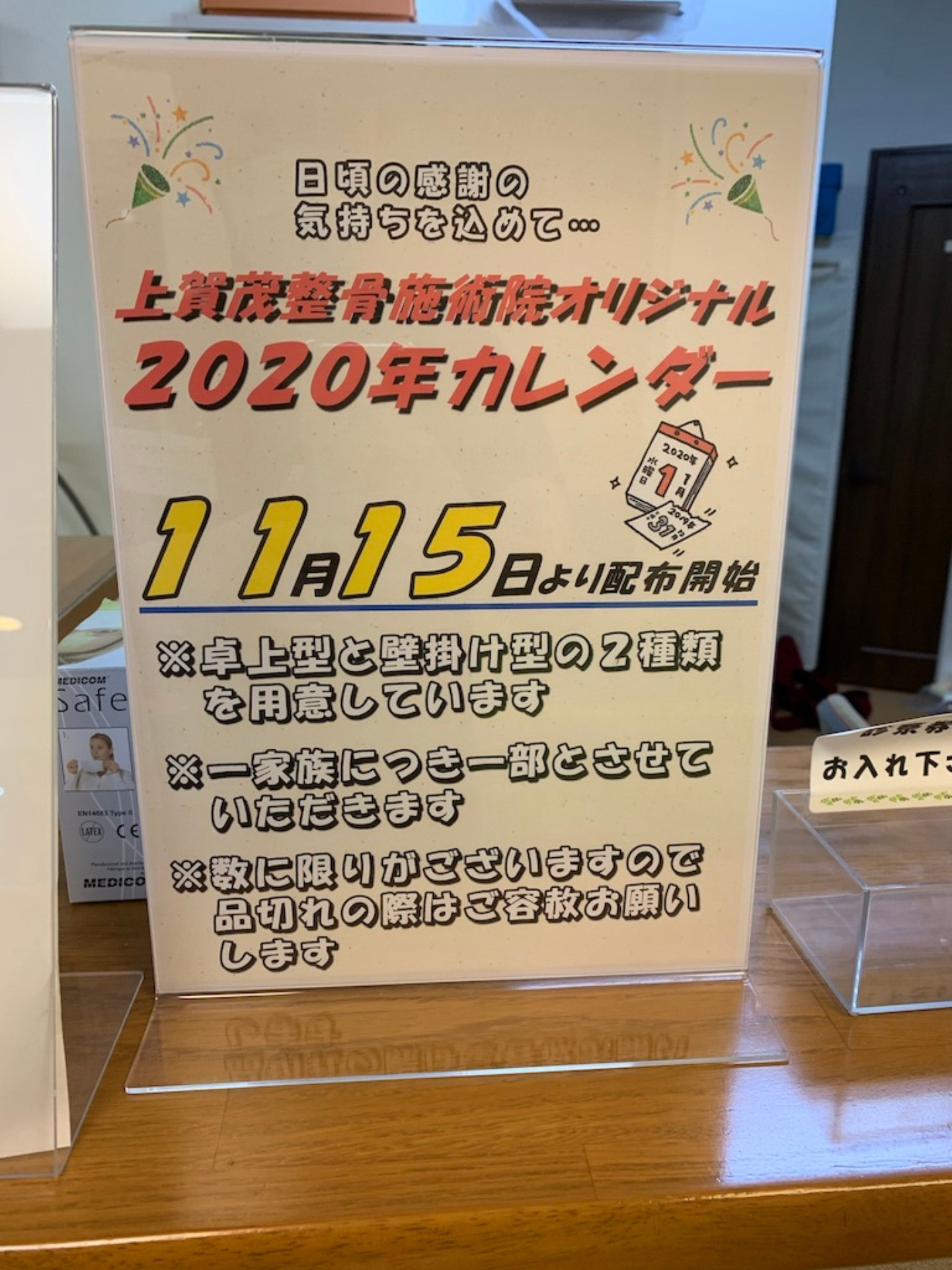 京都市北区での交通事故治療は『上賀茂整骨施術院』にお任せ下さい。 2019/11/14 2020年カレンダー配布開始!! タイトル通りです(笑) 明日、15日(金)より当院オリジナルの2020年カレンダーを 配布します(^^) 数量限定/早い者勝ち☆ 皆さま、お早めに〜 ※なくなり次第終了 ※数に限りがあるため1家庭につき1部とします
