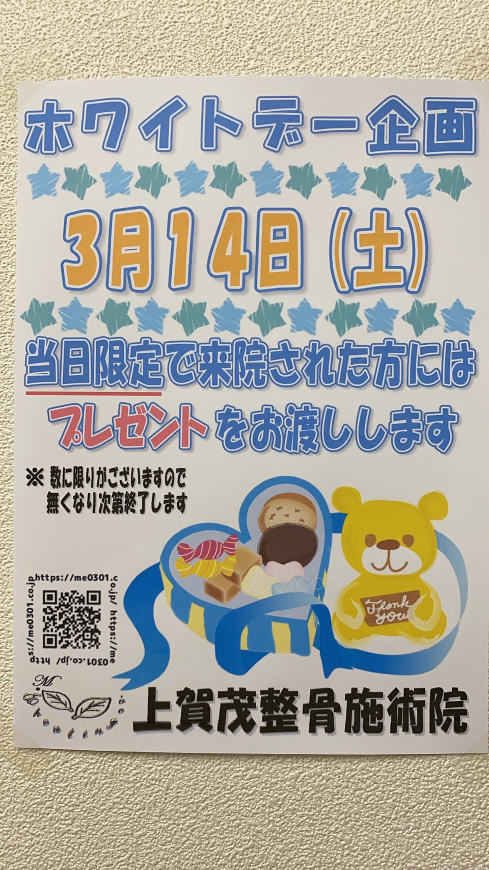 京都市北区での交通事故治療は『上賀茂整骨施術院』にお任せ下さい。 2020/03/13 みなさん、こんにちは(^^) 明日はホワイトデーですね!! ってことで、恒例のイベントです☆ 明日、来院された方には特典を用意しています。 数に限りがありますのでご了承ください。 では、たくさんのご来院をお待ちしております(^^)