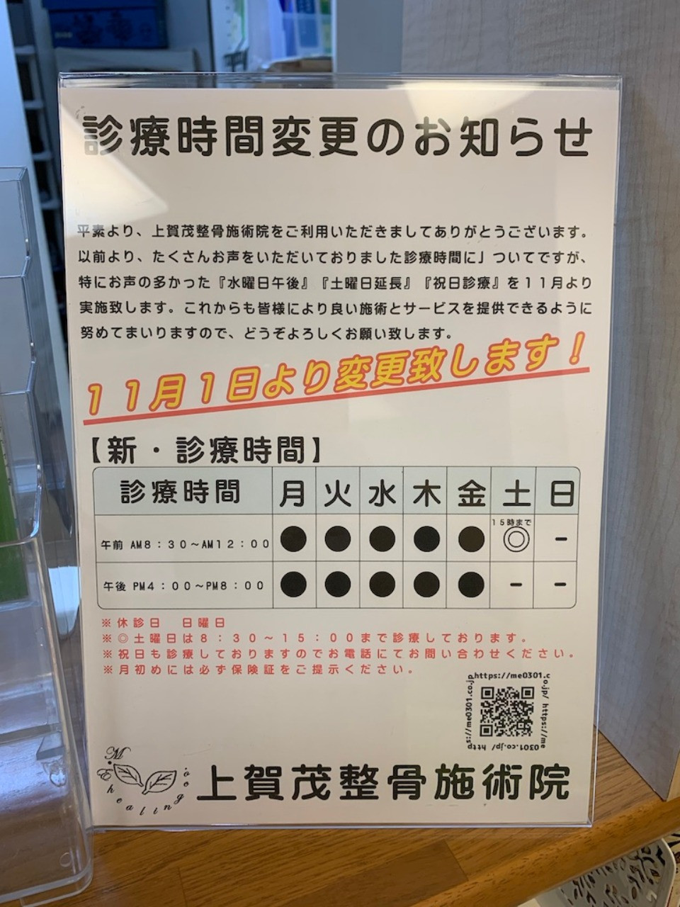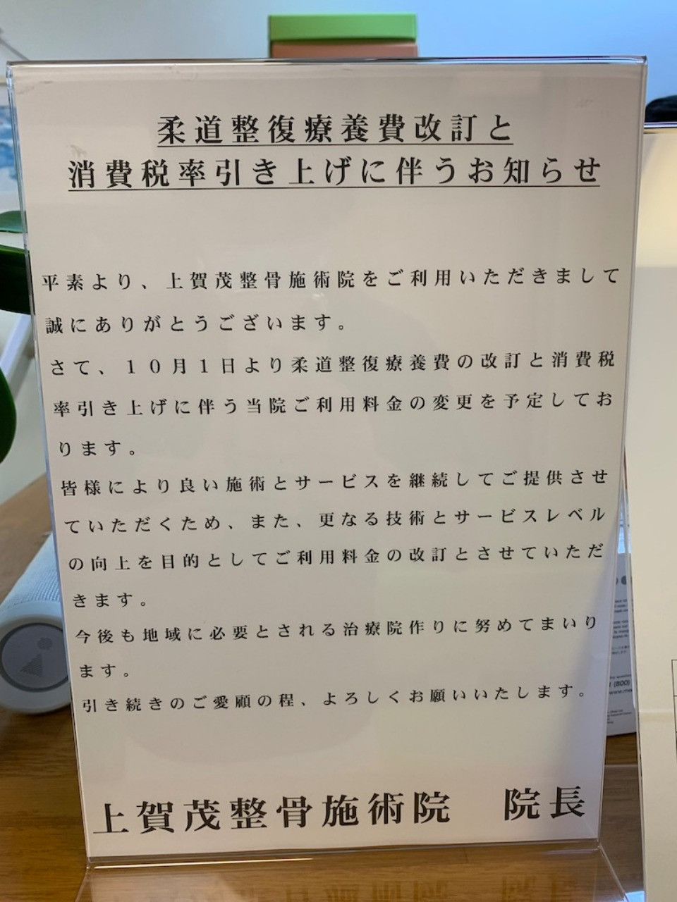診療料金変更のお知らせ 2019/09/18 診療料金変更のお知らせ 診療料金変更のお知らせ 朝晩と心地良い気候になってきました。 いよいよ夏も終わり秋の訪れを感じさせます。 10月1日より消費税率と柔道整復療養費の変更に伴い当院診療料金の変更を行います。 色々とご迷惑をおかけしますが、ご理解の程よろしくお願い致します。
